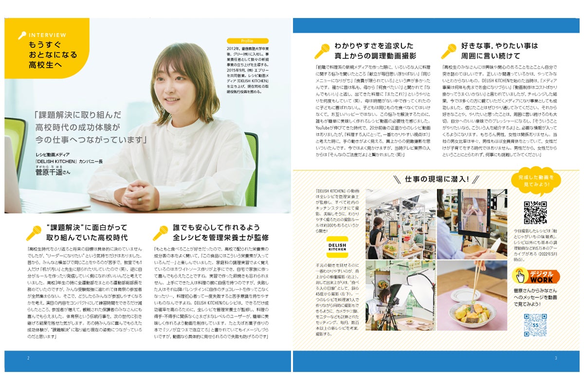 また、家庭科教育のなかでも近年重視されているキャリアデザイン、ライフプランなどについて取締役 執行役員 DELISH KITCHEN カンパニー長の菅原のインタビューも掲載。現在のキャリアにいたるきっかけや、高校生がこれからのキャリア形成を考えていくにあたってのアドバイスなどについてお答えしています。